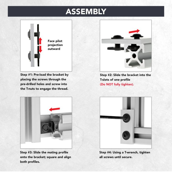 The 2 hole - straight flat plate is an external fastening method that requires no machining services. It is a durable connection that can be easily repositioned and reused. This flat plate can provide infinite positioning along the profile T-slot, allowing for a large degree of adjustability. It engages the 2-degree drop-lock feature for most profile series when the assembly bolts are tightened to the required torque, creating a strong connection. Tip: Pre-load your hardware prior to connecting profiles to simplify your assembly and save time.