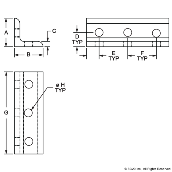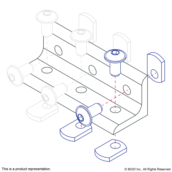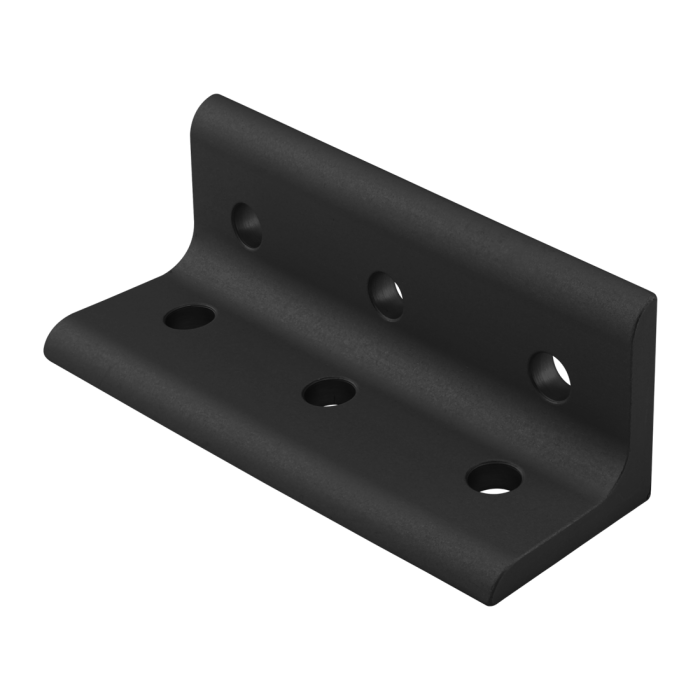 The 6 hole - wide 3x3 inside corner bracket is an external fastening method that creates a 90 degree connection. There are three adjacent holes on each side of the bracket. It requires no machining services and can provide infinite positioning along the profile T-slot, allowing a large degree of adjustability. The bracket engages the 2-degree drop-lock feature when the assembly bolts are tightened to the required torque. It is a fastening method that can be repositioned and reused.
