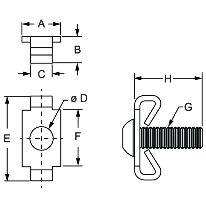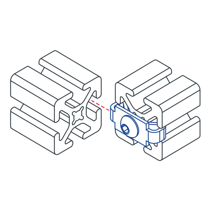 The standard end fastener assembly is comprised of a button head socket cap screw and wing clip. The end fastener provides a fixed, 90 degree, moderate-strength connection that is completely hidden. The winged tabs of the clip prevent the mating profile from rotating. This connection method requires two machining services; an end tap on the mounting profile and an access hole in the mating profile in order to reach the screw head. Additional Information: Wing clips are available separately (without the button head socket cap screw) for instances where you want to create your own custom assembly.