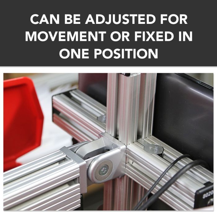 The 2 hole - pivot joint is an external fastening method that is lightweight yet sturdy. This connector can either mount to the end of a profile, which would require an end tap, or the slot tabs can be removed for mounting directly to the T-slot without any required machining services. The screws on the arms can be adjusted for movement or fixed in one position